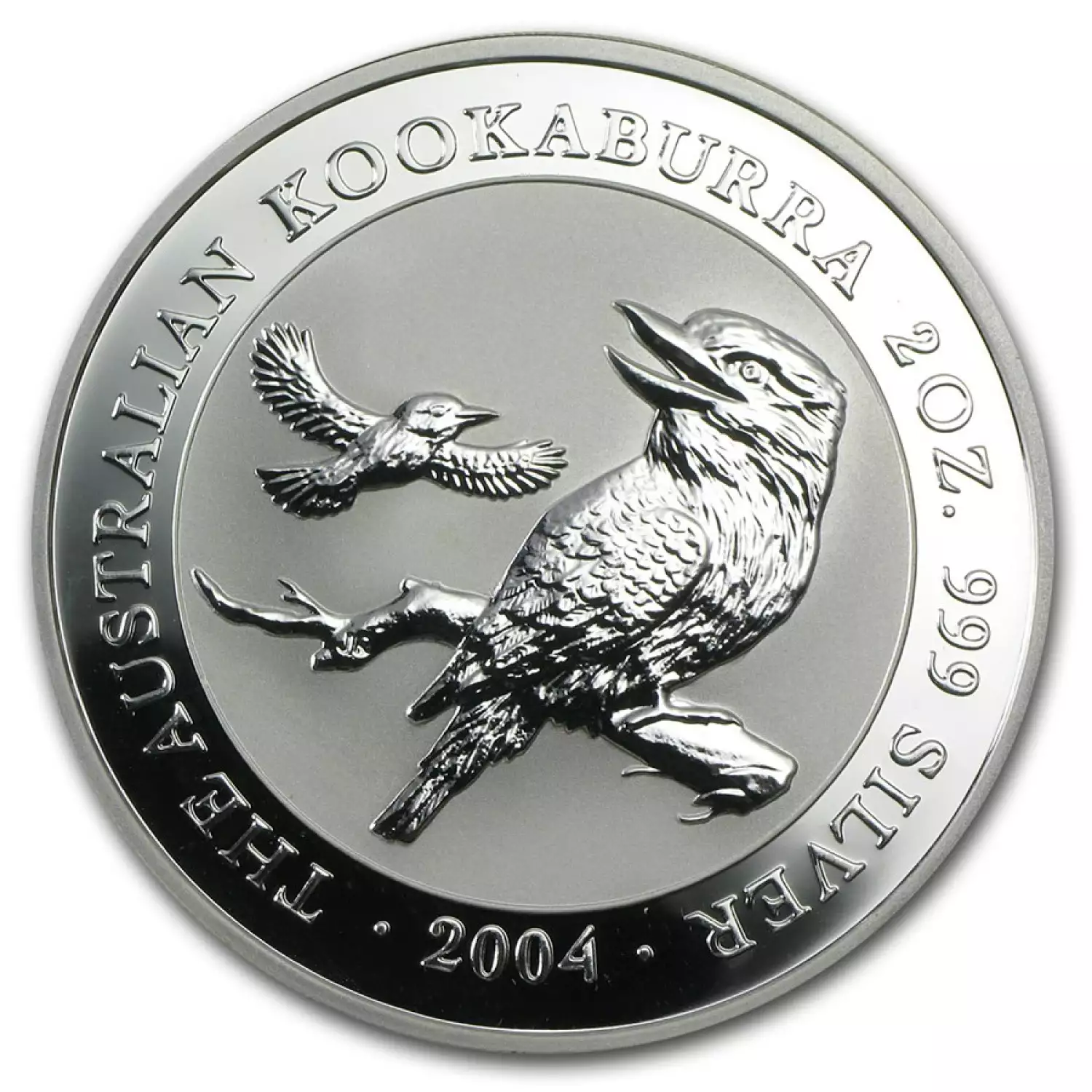 The Silver Kookaburra series is loved by collectors around the world for its annually changing designs. Each 2004 2 oz Australian Perth Mint Silver Kookaburra is composed of 2 troy ounces of 0.999 fine silver.