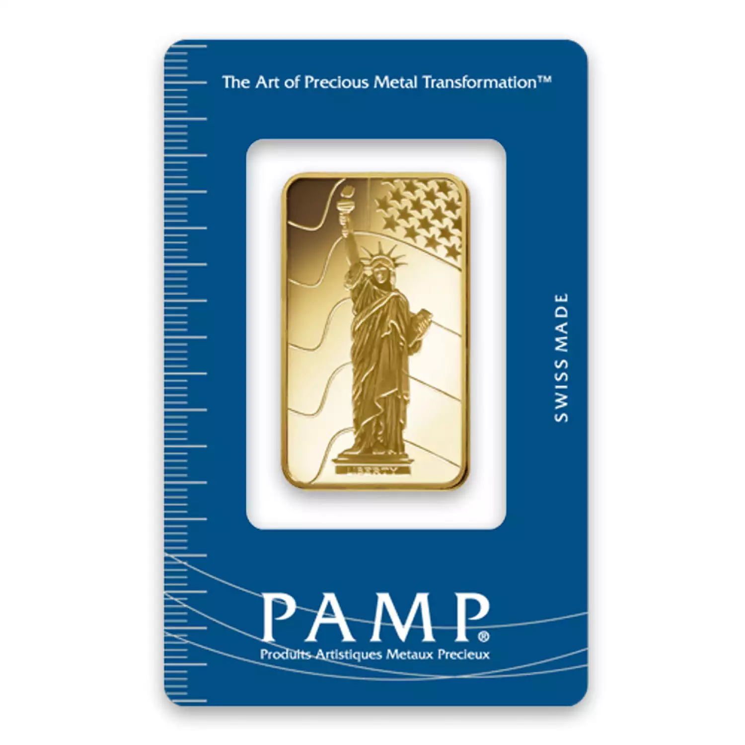 Each 10g PAMP Gold Bar - Liberty is composed of 1 troy ounce of .9999 fine Gold. The obverse of the gold bar features the Statue of Liberty with the Stars and Stripes flowing behind her.