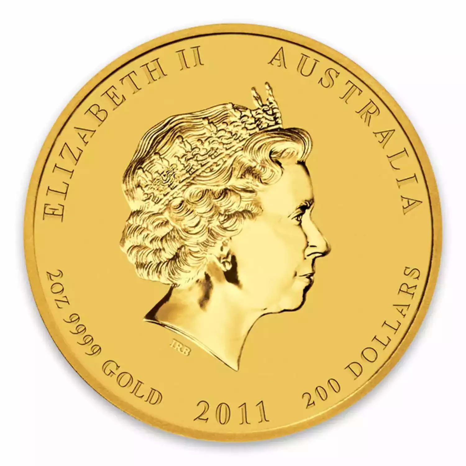The 2011 2 oz Australian Perth Mint Gold Lunar II: Year of the Rabbit is composed of 2 oz of .9999 pure Gold. This coin is minted by the Perth Mint and guaranteed by the government of Australia.