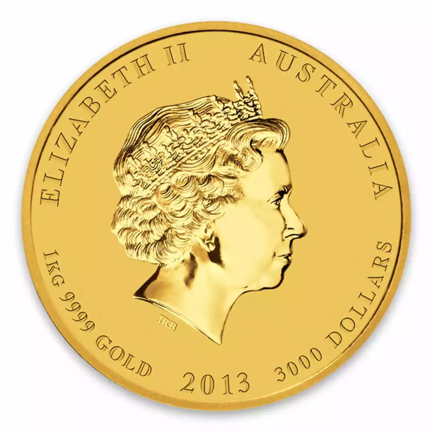 The 2013 1kg Australian Perth Mint Gold Lunar II: Year of the Snake is guaranteed by the government of Australia. This gold coin features an image of a snake curling amongst grass and bamboo shoots on the reverse. The obverse side of the coin displays the portrait of Her Majesty Queen Elizabeth II.